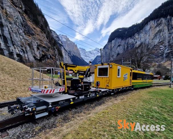 La JR1050 EVO a été spécialement conçue pour être montée sur un wagon de marchandises freiné en fonction de la charge (wagon porteur modulaire) par la société Ferdinand Steck Maschinenfabrik AG et convient parfaitement à l'entretien des installations ferroviaires et des lignes électriques aériennes des chemins de fer à crémaillère.