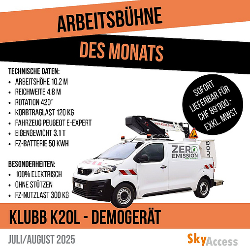 100 % elektrisch, kompakt und sofort einsatzbereit – die K20L von KLUBB GROUP auf einem Peugeot E-Expert bringt Sie effizient auf Höhe!